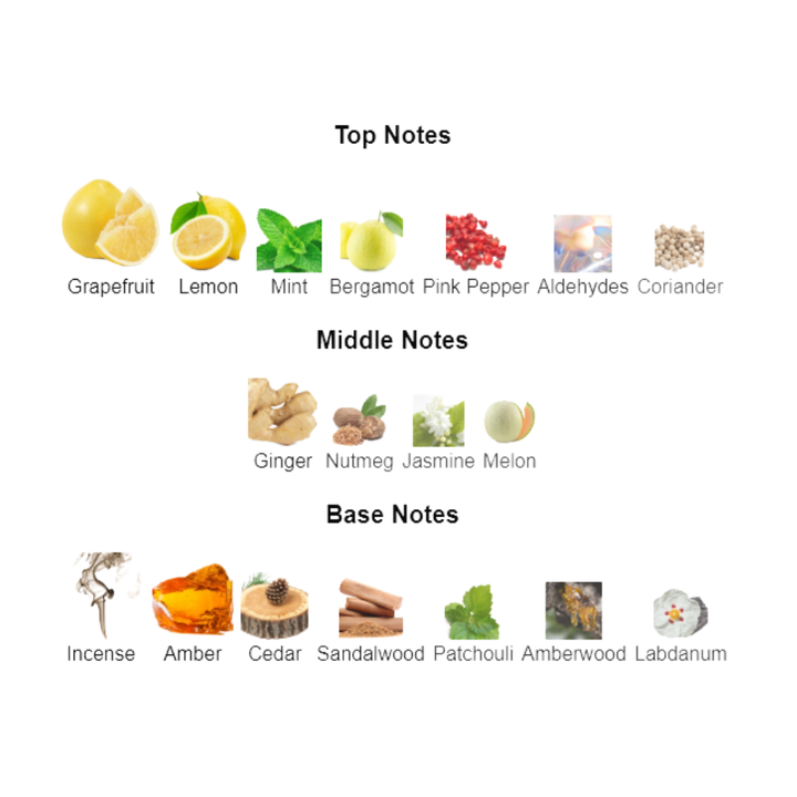 The fragrance features a fresh citrus accord followed by ambery cedar. Woody notes are amplified by tonka bean and vanilla for heightened sensuality. New Caledonian sandalwood unfolds at the base for greater depth, leaving a captivating trail.