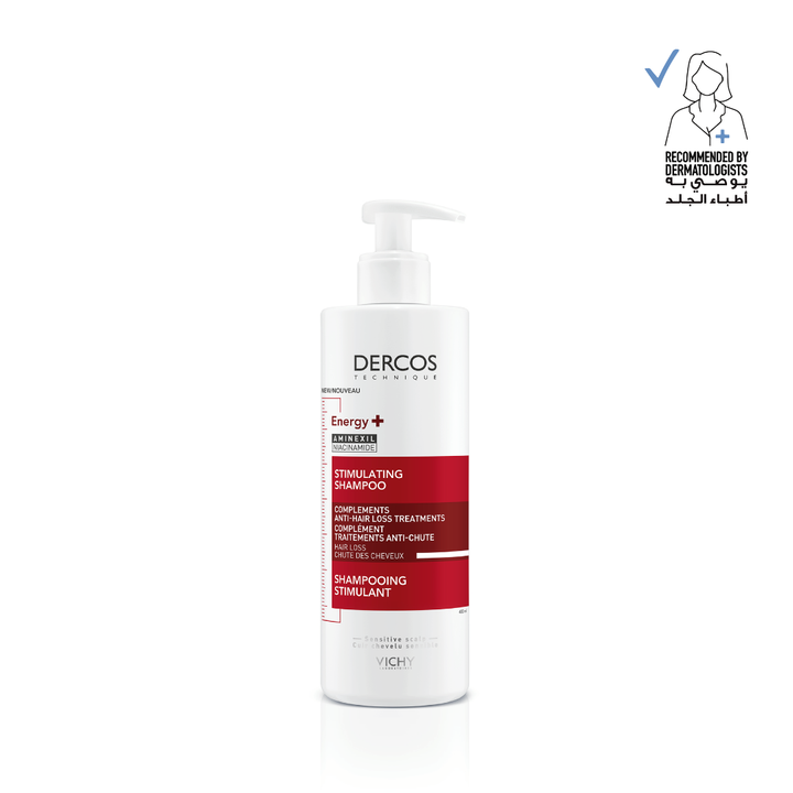 Vichy Dercos Energising Anti Hair Fall Shampoo is enriched with Vichy's patented molecule Aminexil and vitamins PP, B5, and B6, Energising Shampoo is designed to reduce the rate of hair loss and maintain the density of thinning hair.